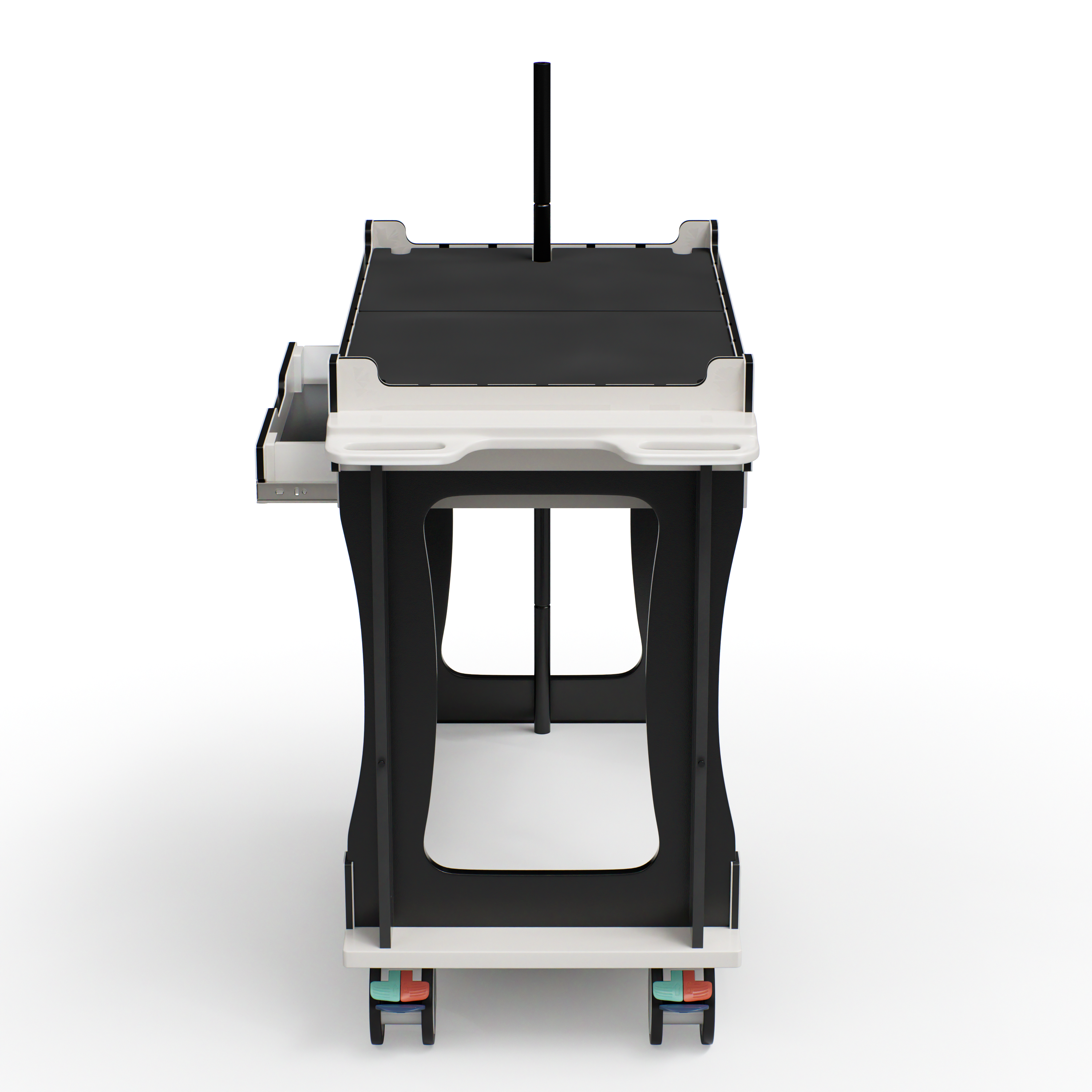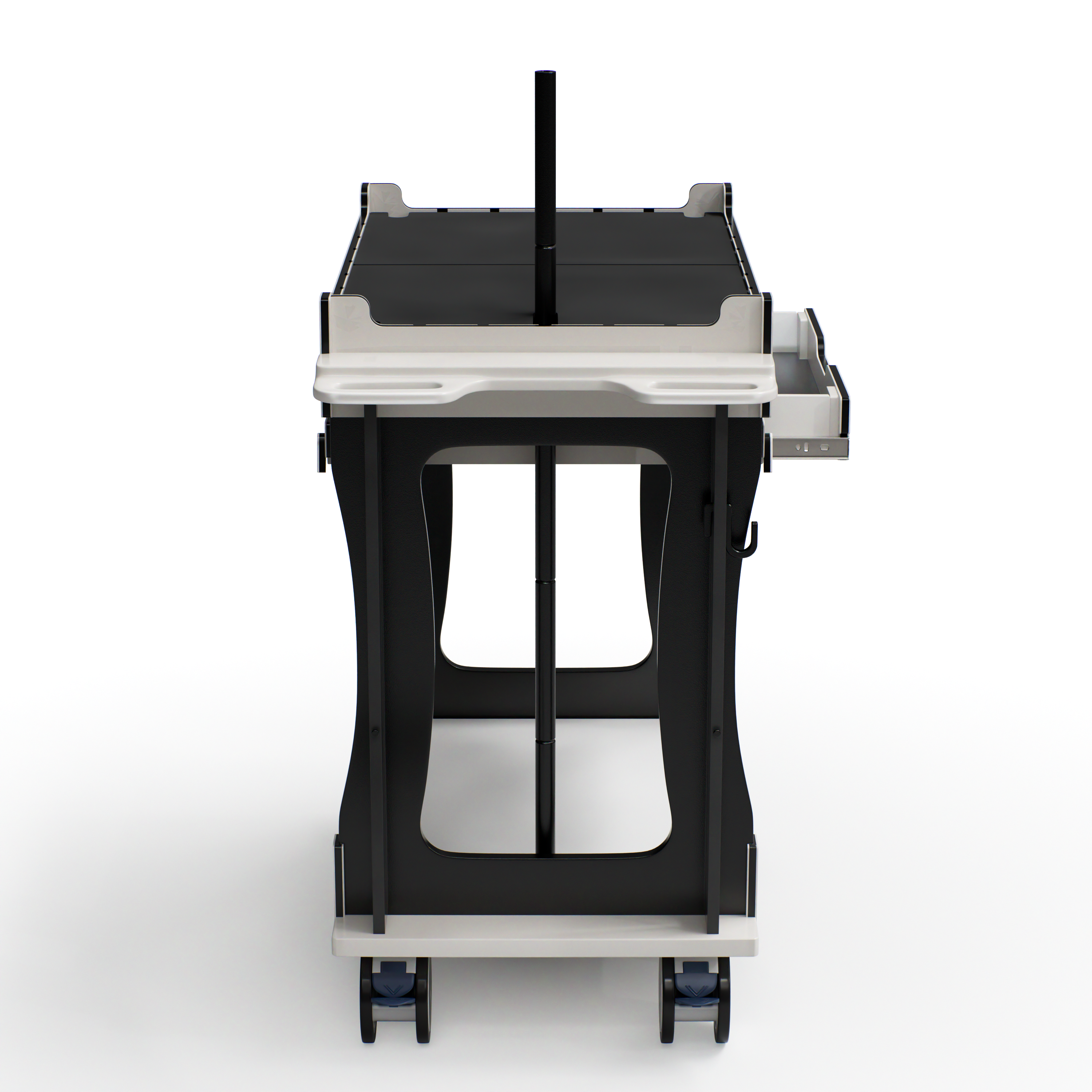 The removable work top provides expanded workspace when deployed and stores on the sides of the cart when not in use.